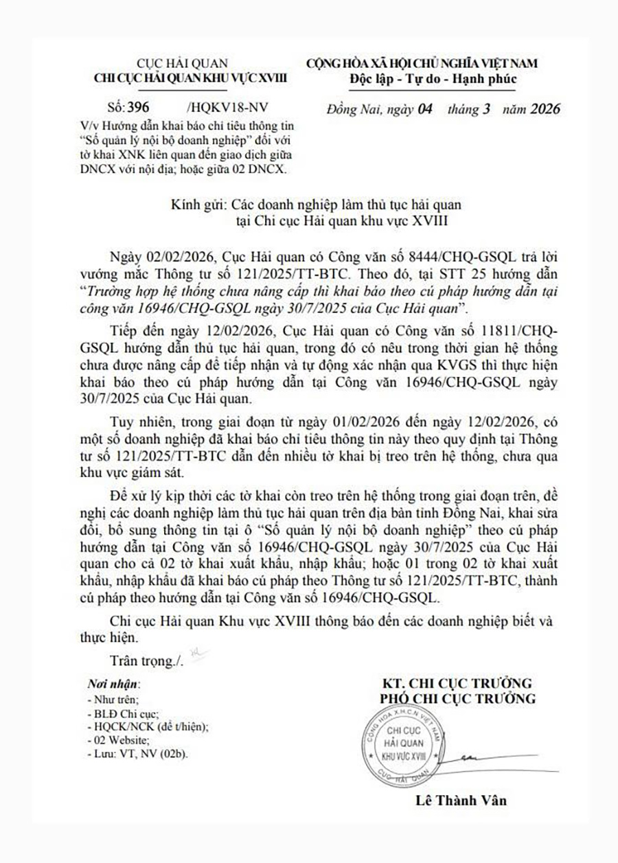 Công văn số 396/HQKV18-NV ngày 04/3/2026 hướng dẫn khai báo chỉ tiêu “Số quản lý nội bộ doanh nghiệp” đối với tờ khai XNK liên quan đến giao dịch giữa doanh nghiệp chế xuất (DNCX) với doanh nghiệp nội địa hoặc giữa 02 doanh nghiệp chế xuất.