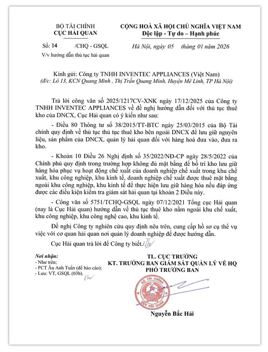 Công văn 14/CHQ-GSQL, ngày 05/01/2026 của Ban Giám sát quản lý về việc hướng dẫn thủ tục hải quan đối với thủ tục thuê kho của DNCX.