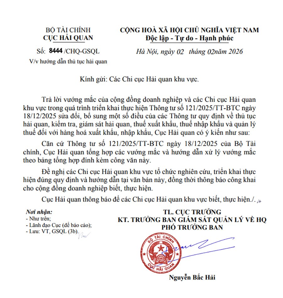 Công văn số 8444/CHQ-GSQL do Cục Hải quan ban hành ngày 02/02/2026 về việc hướng dẫn thủ tục hải quan theo Thông tư số 121/2025/TT-BTC. Chi tiết công văn: