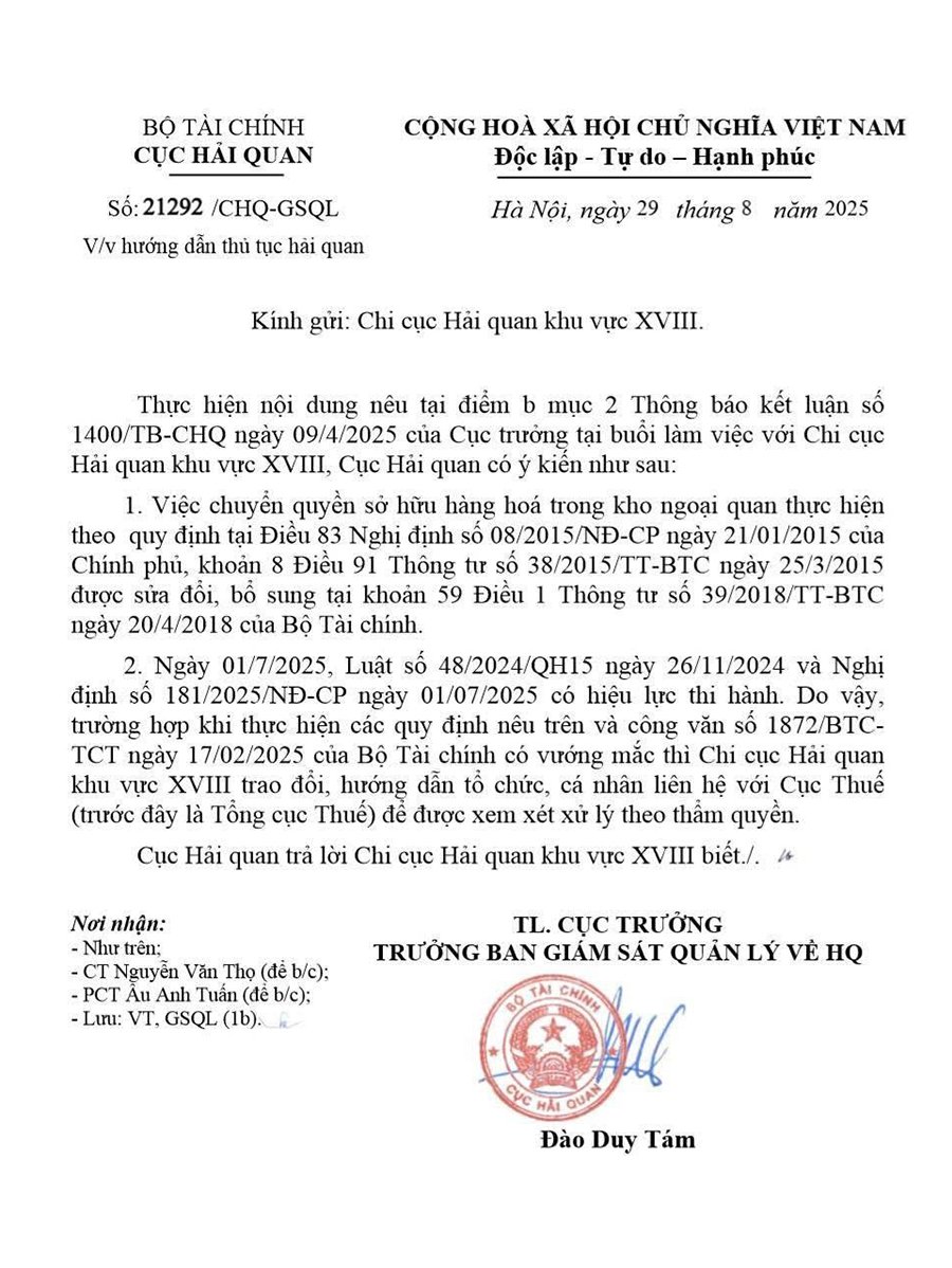 Công văn số 21292/CHQ-GSQL của Cục Hải quan