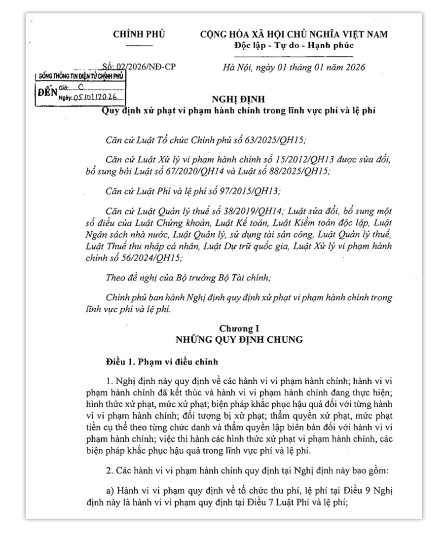 Nghị định số 02/2026/NĐ-CP của Chính phủ Quy định xử phạt vi phạm hành chính trong lĩnh vực phí và lệ phí