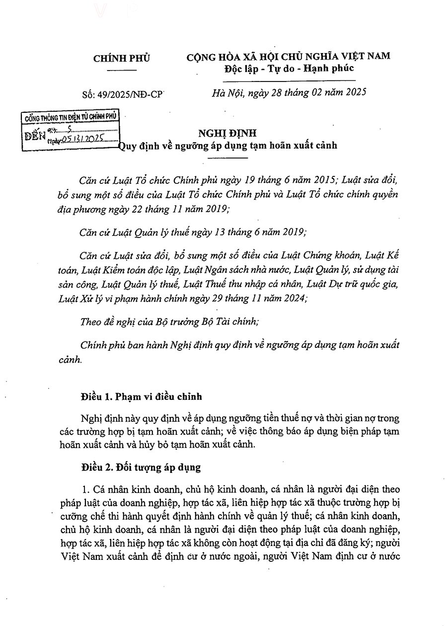 Nghị định số 49/2025/NĐ-CP của Chính phủ quy định về ngưỡng áp dụng tạm hoãn xuất cảnh.