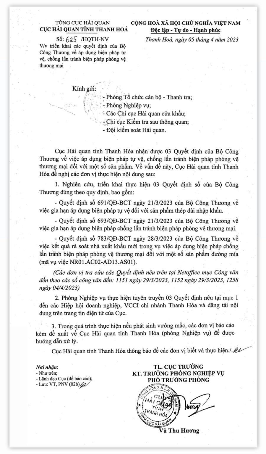 Thông báo 625/HQTH-NV của Cục Hải quan Thanh Hóa về việc triển khai các quyết định của Bộ Công Thương về áp dụng biện pháp tự vệ, chống lẩn tránh biện pháp phòng vệ thương mại